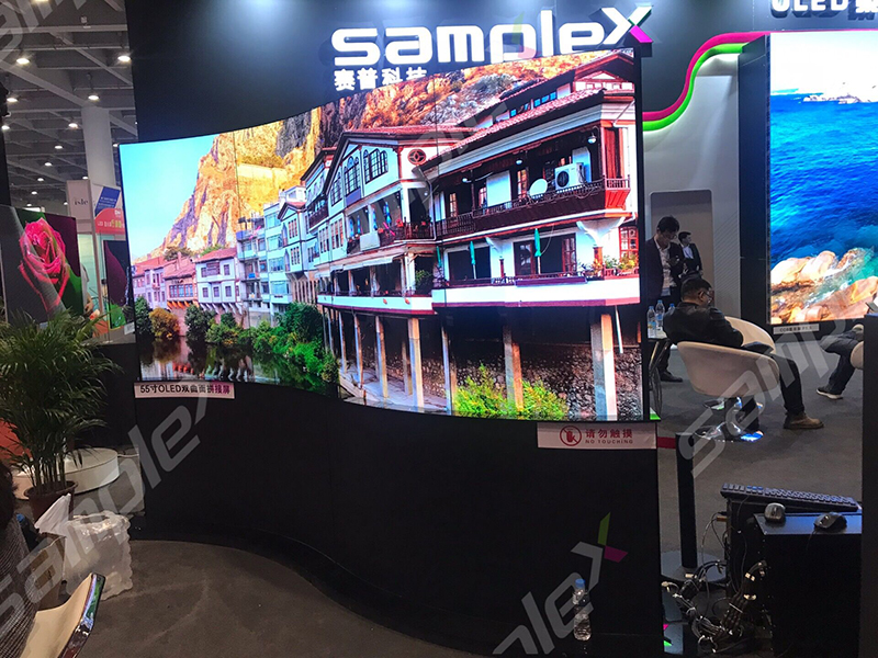 說(shuō)到OLED中的顏值擔當,以這款55寸OLED雙面曲面拼接屏為首,如同中國傳統文化元素屏風(fēng)一樣立地而起,古韻風(fēng)雅而又不失時(shí)尚與科技感,為賽普科技整個(gè)展位提高空間的品位。