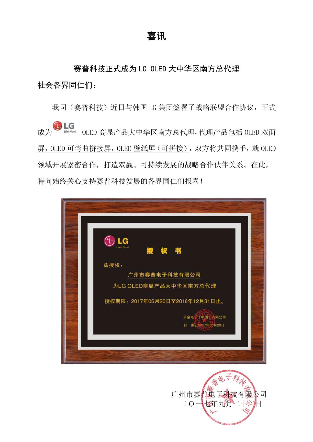 社會(huì )各界同仁們: 我司(賽普科技)近日與韓國LG集團簽署了戰略聯(lián)盟合作協(xié)議,正式成為 OLED商顯產(chǎn)品大中華區南方總代理