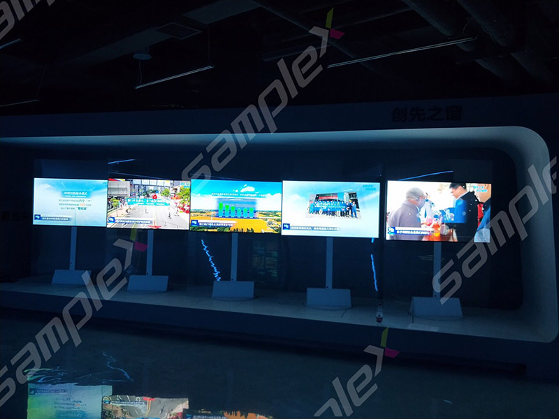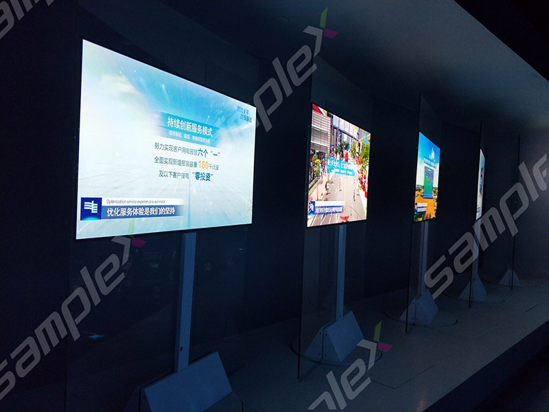 整個(gè)營(yíng)業(yè)廳通過(guò)高科技的多媒體展示手段介紹電網(wǎng)的建設與發(fā)展歷程,多媒體展示可謂是花樣百出,有多媒體沙盤(pán)、液晶拼接墻、LED顯示屏、VR、電子圖表、互動(dòng)櫥窗、虛擬成像、投影儀等等,展館現場(chǎng)讓人耳目一新的當選這一字排開(kāi)貼在玻璃上的超薄OLED壁紙屏,展現的模式一改傳統的“一堵墻”,在空間利用率和創(chuàng )意展示方面來(lái)說(shuō)OLED無(wú)疑是最佳的展示首選,每一塊屏都是一個(gè)獨立體,而又相互呼應,180°的旋轉功能,無(wú)論是整屏播放關(guān)于電網(wǎng)的發(fā)展歷程或是分屏展示智慧家庭改造、智能辦公環(huán)境及智能配電房監控數據亦或是倡導科學(xué)用電的宣傳片等,讓參觀(guān)者全方位的觀(guān)看到電網(wǎng)給大家帶來(lái)的精彩之余并且讓大家更有趣味的了解電力的過(guò)去、現在以及未來(lái),從而更好的倡導科學(xué)用電理念。