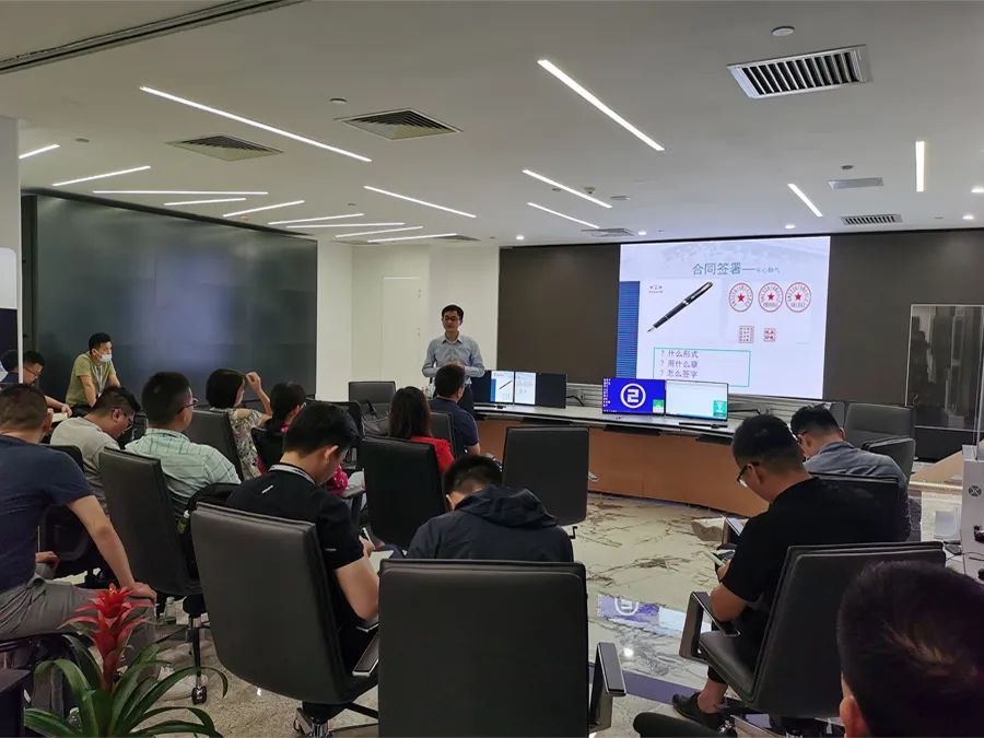 法務(wù)專(zhuān)題培訓在展廳開(kāi)展,我司特邀請某知名律師所楊律師主要就合同的簽訂、履行、施工過(guò)程中的簽證和結算等問(wèn)題進(jìn)行針對性的講解和培訓。